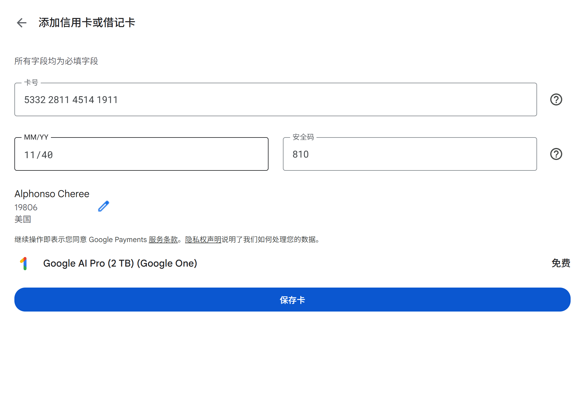 输入完成后点击保存卡,然后确认支付,并不会扣款,然后你的Google One Pro就会生效。