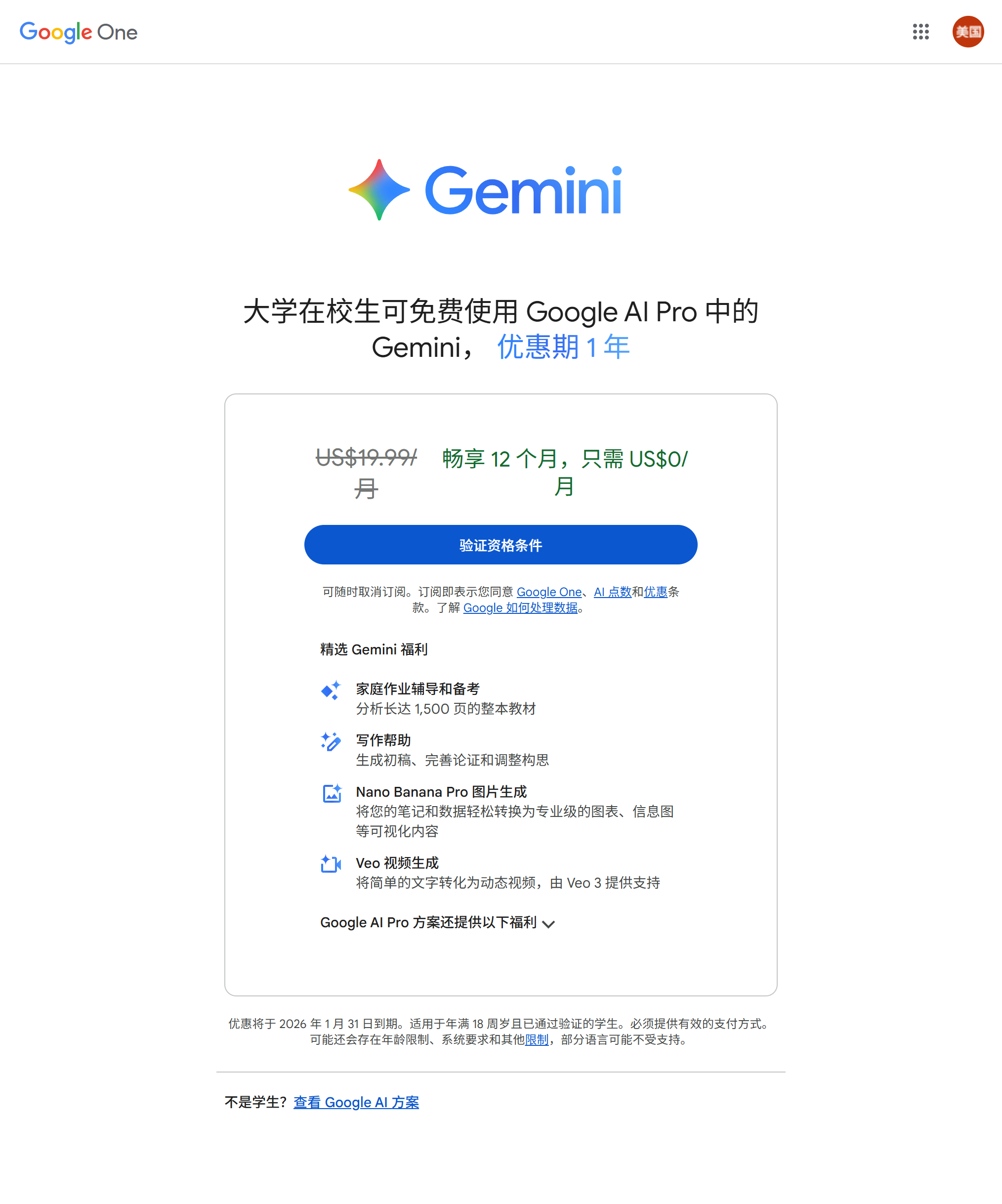 成功完成后,访问https://one.google.com/ai-student, 其实就是原来的那个页面,刷新一下也行。你将看到下面的页面,这就说明成功完成验证了。